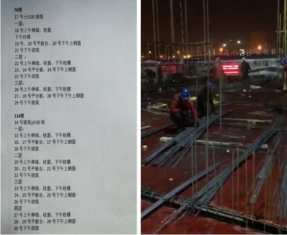 為完成春節(jié)前夕項目部7#號樓三層封頂、11#號樓四層封頂任務(wù),二分公司領(lǐng)導(dǎo)班子高度重視,分公司生產(chǎn)副經(jīng)理孟慶武扎根在一線監(jiān)督指導(dǎo)。時間緊,任務(wù)重是項目部面臨的嚴峻挑戰(zhàn),在困難面前,項目全體人員沒有退縮,制定了切實可行、精準高效的施工方案。一方面針對班組實行獎懲措施,兩班倒策略,對提前完成計劃任務(wù)的班組給與獎勵,對完不成的班組給與處罰。另一方面項目部全程跟蹤、精心組織,晝夜奮戰(zhàn)。在項目部全體員工的共同努力下,四天完成一層結(jié)構(gòu),充分發(fā)揚了二建人攻堅克難的精神。