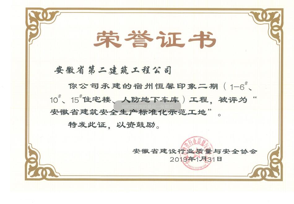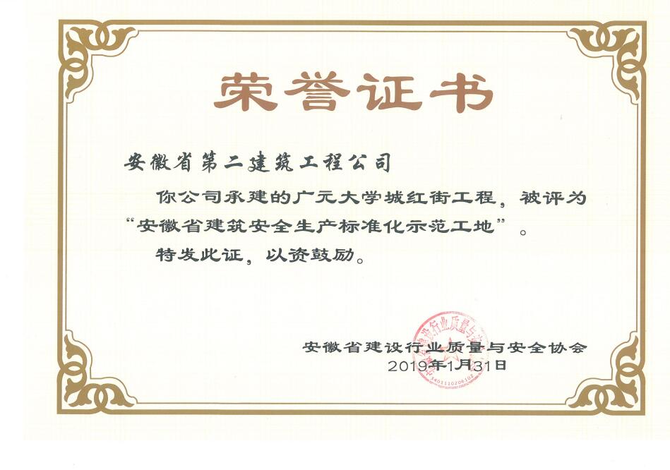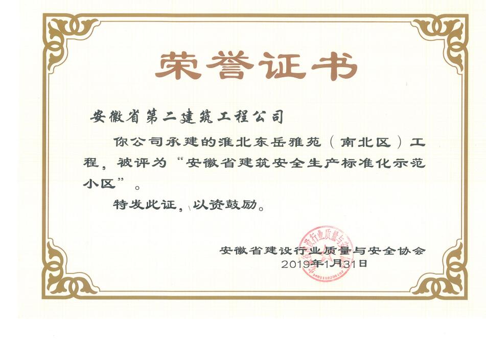 近日,從安徽省建設(shè)行業(yè)質(zhì)量與安全協(xié)會獲悉,安徽二建承建的肥西涼亭雅苑、阜陽楓林源筑、阜陽廣元大學(xué)城、宿州恒馨印象、淮北東岳雅苑5個項(xiàng)目獲得2018年度“安徽省建筑施工安全生產(chǎn)標(biāo)準(zhǔn)化示范工地”稱號,為公司再添榮譽(yù)。